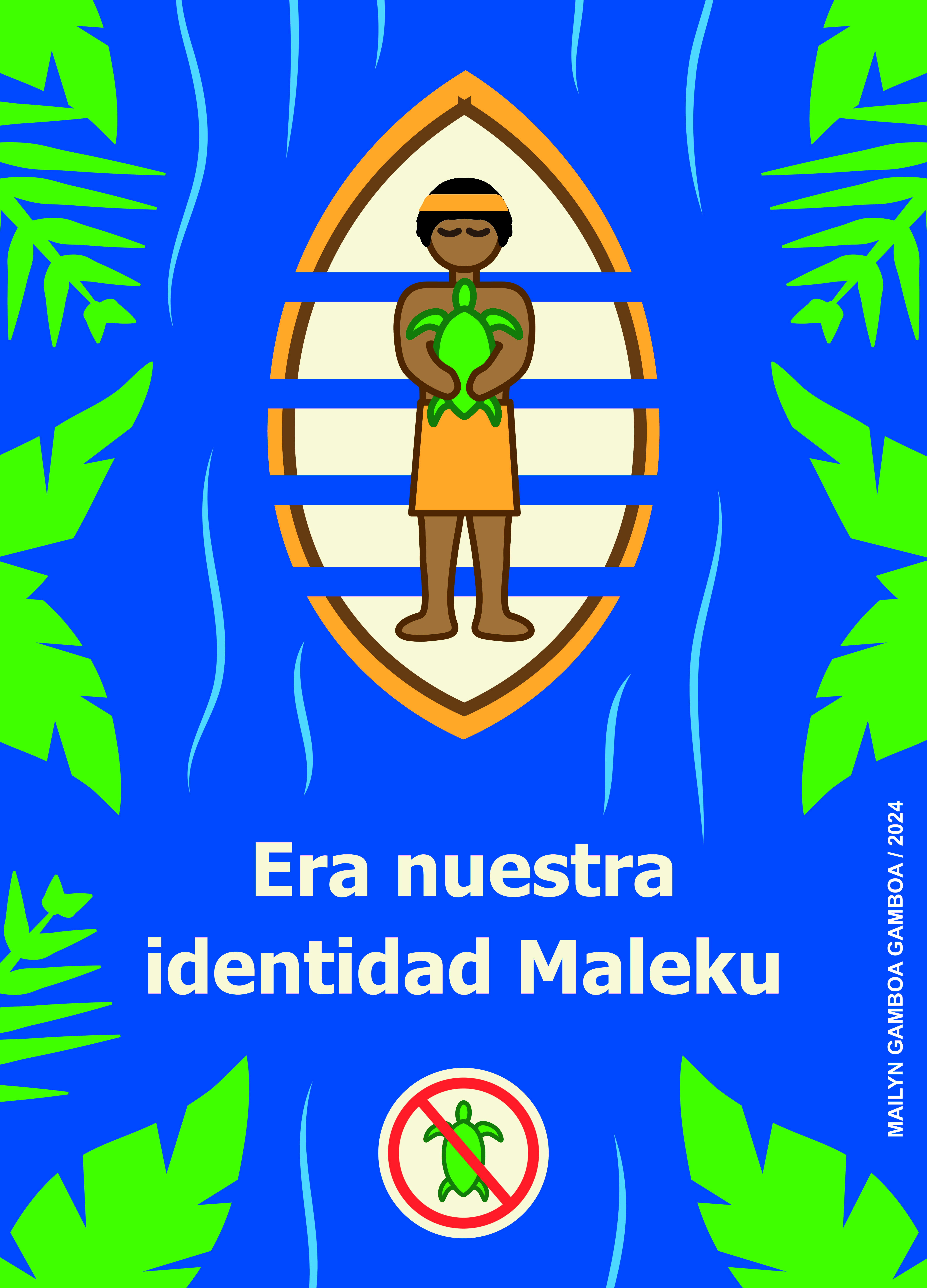 | dc.description | El cartel presenta una de las tradiciones del pueblo Maleku, cuyas comunidades indígenas son Tonjibe, Margarita y El Sol. Estos pueblos han disminuido su población por distintas causas, como epidemias, usurpación de tierras y actividades de los huleros, entre otras. Las comunidades mantienen una profunda conexión con su entorno natural, especialmente con el Refugio de Vida Silvestre Caño Negro, un área rica en biodiversidad que ha sido fundamental para su supervivencia cultural y material durante siglos. Entre las especies que habitan Caño Negro, las tortugas han tenido un papel significativo en las tradiciones y la alimentación del pueblo Maleku. Sin embargo, la prohibición de cazar tortugas, aunque necesaria para su conservación, ha tenido un impacto importante en las tradiciones y la vida cotidiana de esta comunidad. El cartel representa la necesidad de reconocer y respetar las necesidades culturales de los pueblos indígenas al formular políticas de conservación, promoviendo un enfoque que integre la protección del medio ambiente y la preservación de las prácticas culturales ancestrales. Por ello, en el cartel se expresa el texto “Era nuestra identidad Maleku”. Las tradiciones perdidas se representan en el abrazo del indígena con la tortuga, apelando a la nostalgia por las prácticas culturales que han debido abandonarse. La técnica visual de la simetría refuerza la conexión entre el río Caño Negro, el pueblo Maleku y las tortugas como un todo equilibrado. La figura-fondo entre el río y el bote refuerza la relación con Caño Negro y la naturaleza. Los colores predominantes son el azul del agua y tonos café, amarillo y verde, que representan los materiales de la naturaleza. El color rojo simboliza prohibición y aparece en el elemento de la tortuga bajo el símbolo de prohibido. Nota: La representación del color en el cartel corresponde a la concepción de la diseñadora y no necesariamente a la de los pueblos indígenas. | |
